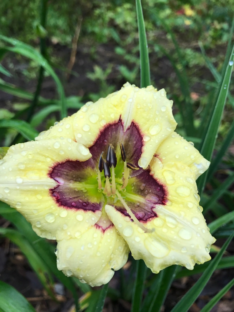 Pale yellow gold with smokey purple eye. Cute as a clump. Evergreen foliage.
