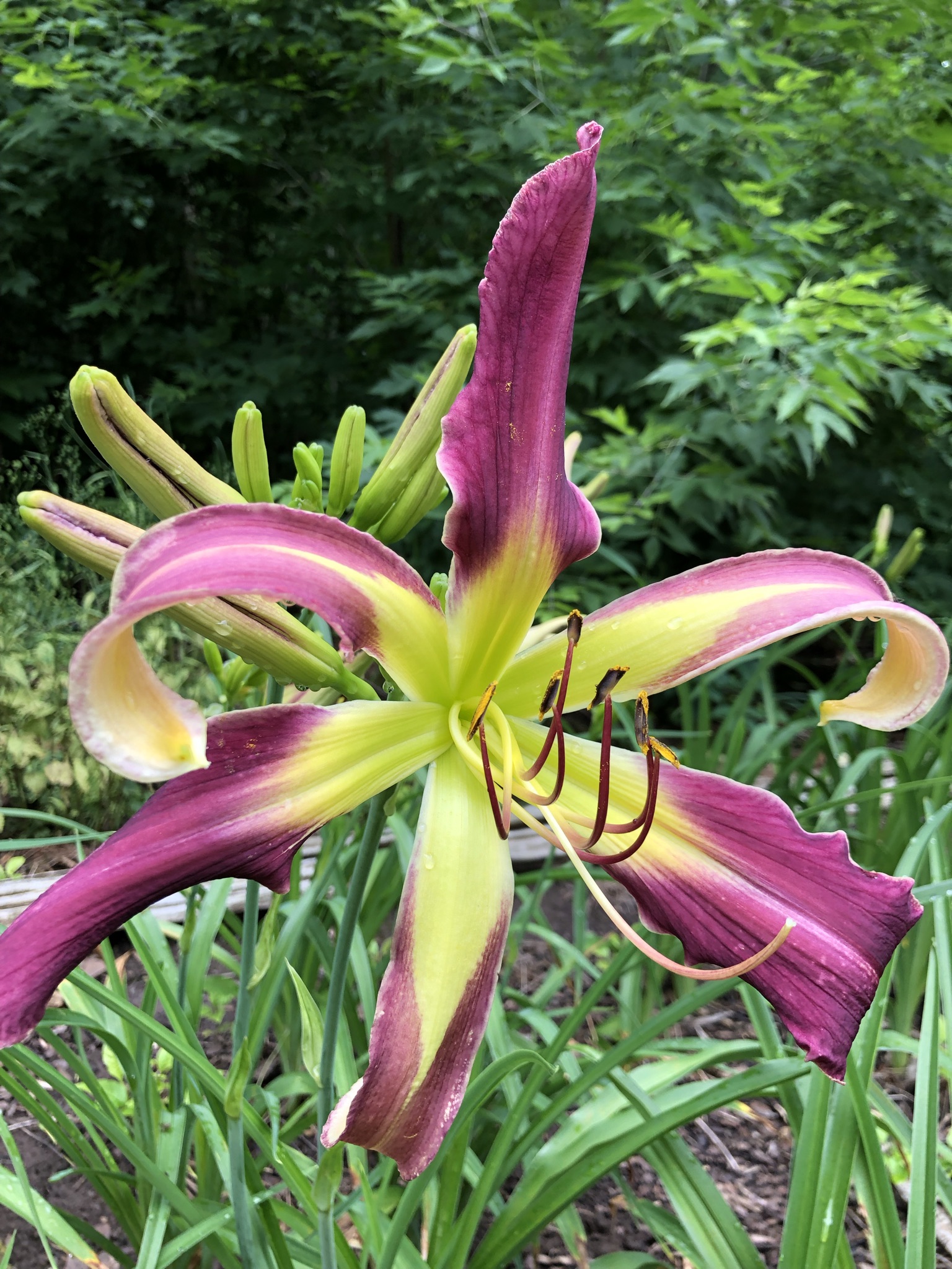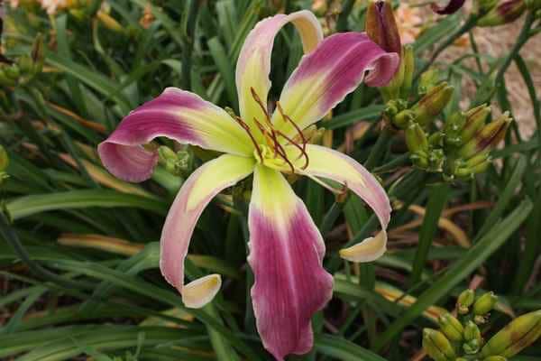 Orchid lavender bicolour with great wingspan. Evergreen foliage. Holds well in high wind, even on those tall spikes.