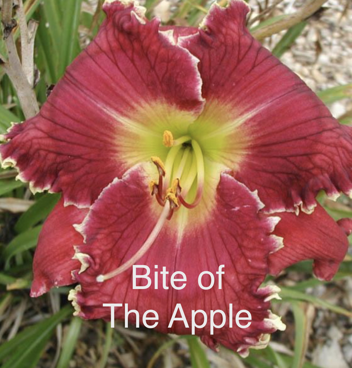 Soft hot pinkish red; cranberry etched icy dark reddish pink eye and edge plus ivory sharks; yellow to green throat. Semi-evergreen. Pix from hybridizer.