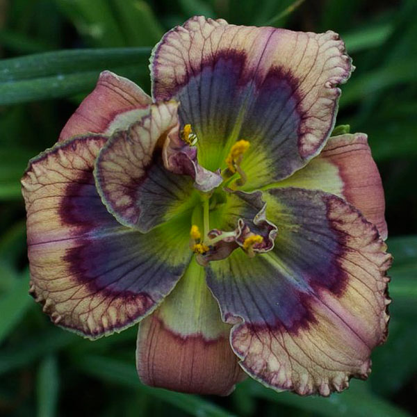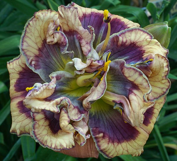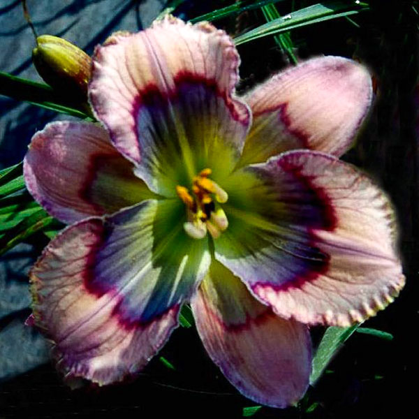 From Gossard: “Blue Beetle has creme pink flowers with a eye zone of charcoal, light blue, blue, lavender blue, lavender purple, purple, maroon and maroon red. Petals even have a start of a gold edge, see outside photo. Blue Beetle is my best introduction for 2010 for many reasons. One of the difficulties of hybridizing for Blue eyed daylilies is that they are blue in the morning and by noon they are more lavender. Blue Beetle is my best one which retains the blue eye in the afternoon, it was and still is my number 1 parent for blue daylilies. Substance is very good and flowers hold up to the evening hours. Thus, I consider Blue Beetle a real break though. Third of the way through bloom, it starts to double. Rebloom scapes can be fully double. Because it does not double all the time, it was not registered as a double. Blue Beetle’s form is in between and can be utilized in round or narrow hybridizing.” Semi-evergreen. 18-22 buds.