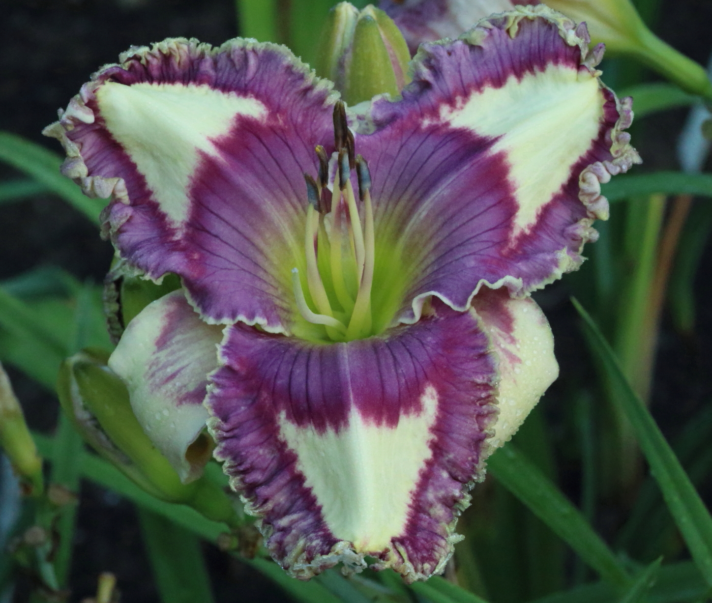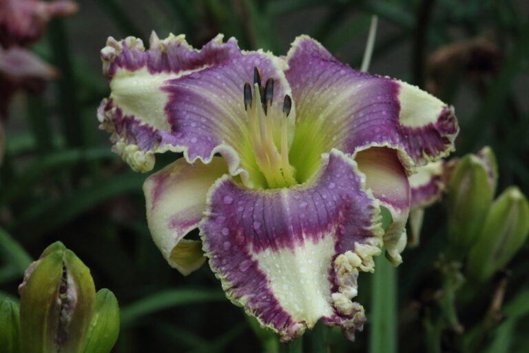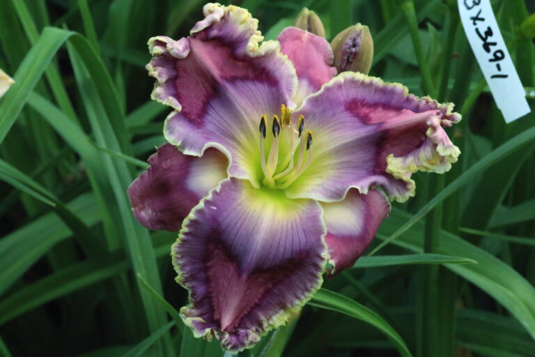 From Korth: “Cream petals, lavender eye with purple outline around green throat. The edge matches the eye pattern but is rimmed with pale gold. (Healing Waters x (Inviting Romance x (Blue Ambition x Jacob’s Well))) x Celestial Water)