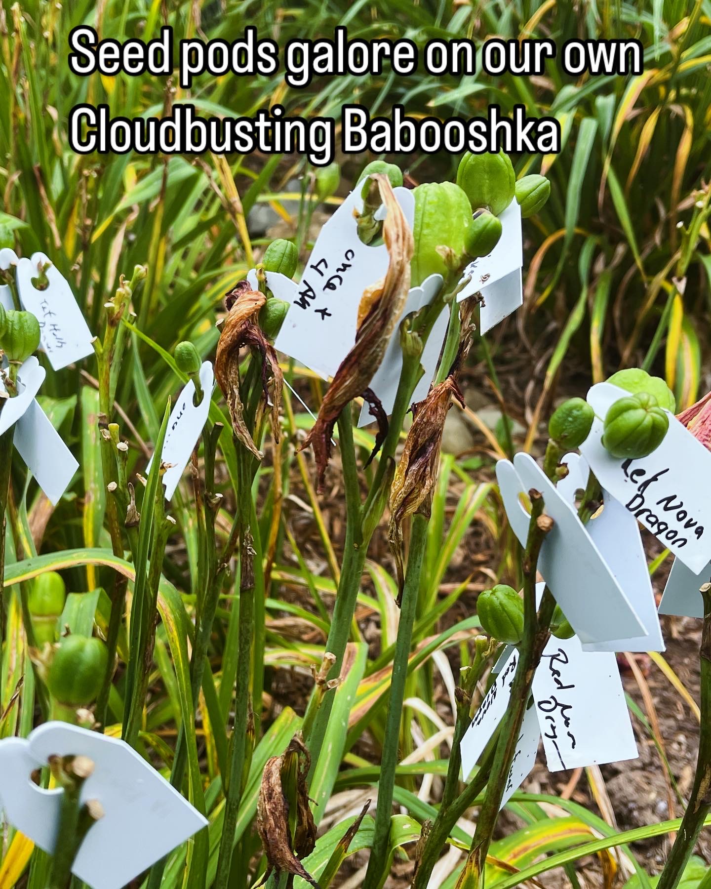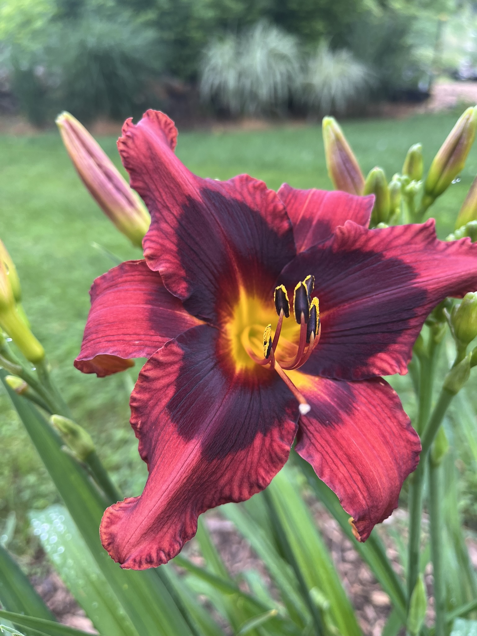 Dark blood red with near black eyezone with subtle black veining throughout. Starts early for us and continues for a long time. Semi-evergreen habit. We’ll tell you the story behind the name when you come for a visit! Progeny of a cross between ‘Wild Horses’ and ‘Velvet Eyes’.