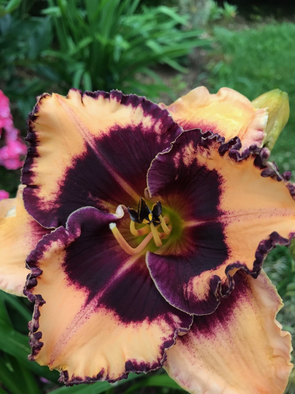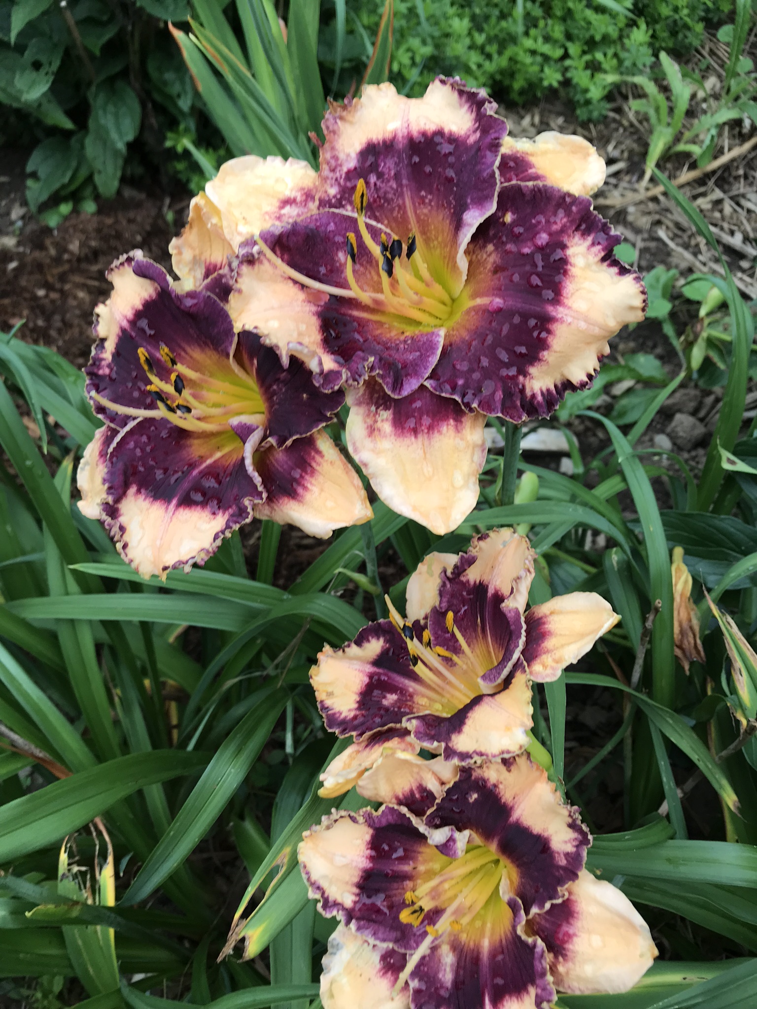 Orchid cream with HUGE lacquered black violet eye. Excellent plant habit with low arching foliage. Semi-evergreen foliage. Opens very well in cool weather.
