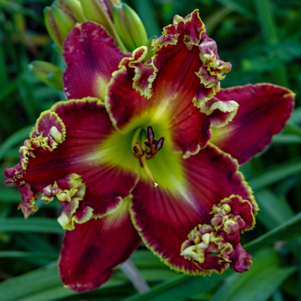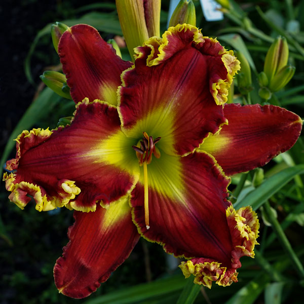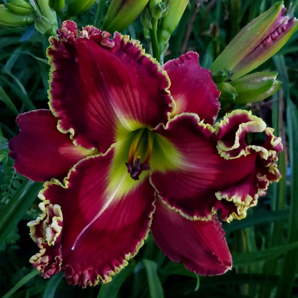 From Gossard’s site: “Flowers are red with lighter red watermark and green throat. Heavy edge varies in color from white, chartreuse, and gold. A fabulous flower with a heavy edge seldom seen in the North. Sometimes huge angel wings appear. I have seen flowers hang occasionally. Been an important flower for breeding with ‘Heavenly New Frontier’ and ‘Wolfman’ kids. It has tetra ‘Rose F. Kennedy’ on both of parents’ side. Northern Hardy.” Semi-evergreen. Pix from Gossard.