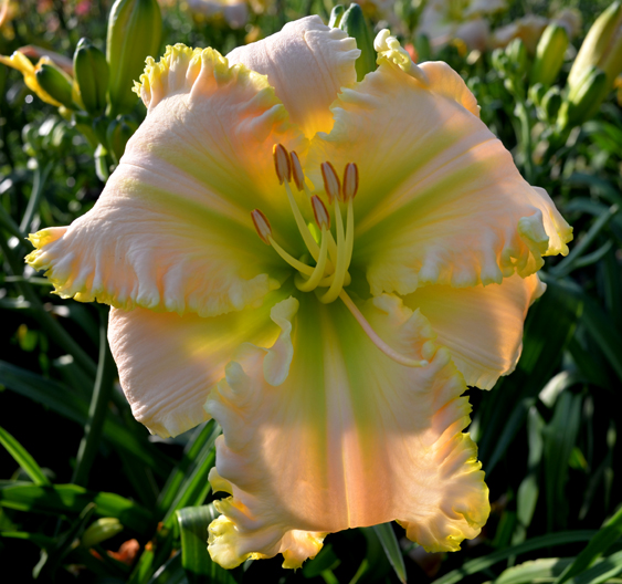 From Pierce: “For most of my adult life I have been telling people that as a daylily hybridizer I breed for bigger and better and am ultimately looking for a flower that “Genetically jumps the fence”. Well that day has arrived in SWAN SONG. I remember walking the seedling fields one morning and there she was… One white bloom in amongst a long cross of a lavender and a rose/pink flowers. As I got closer I could see how different she looked. No way was this just a white seed that had been mixed up. Here was a super heavy substance white with a 1% pink base, bright sparkles and green everywhere. Over half the throat, and into the ruffled petals as well. That was 4 years ago and I still just stare, and use her heavily. GUY’S SWAN SONG will set almost every flower, and she throws BETTER / BIGGER and TALLER! I have a future big white & green where the scape comes up to my chest. Every year I load her up with pods starting in April, May, then into July. That takes a lot of energy. I Harvest the pods, break her up and line her out in the full fun. We never use Banrot etc. and have not lost a plant. I say to you quite proudly; GUY’S SWAN SONG is priceless, for many, many reasons. Whites covered in green for me have become a whole new Program/Passion. And so as the contradiction goes – You’re welcome.” Semi-evergreen/Dormant. Pix from hybridizer.