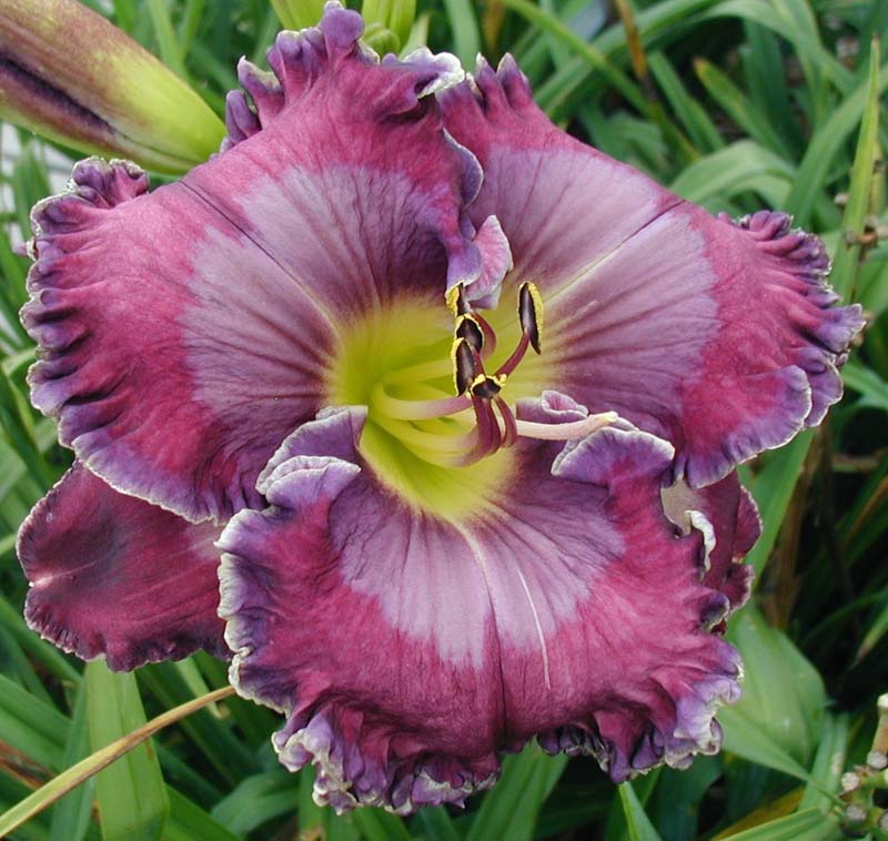 Mix of grape/cranberry/violet; indented icy lavender eye; icy lavender plus ivory edge; green throat.