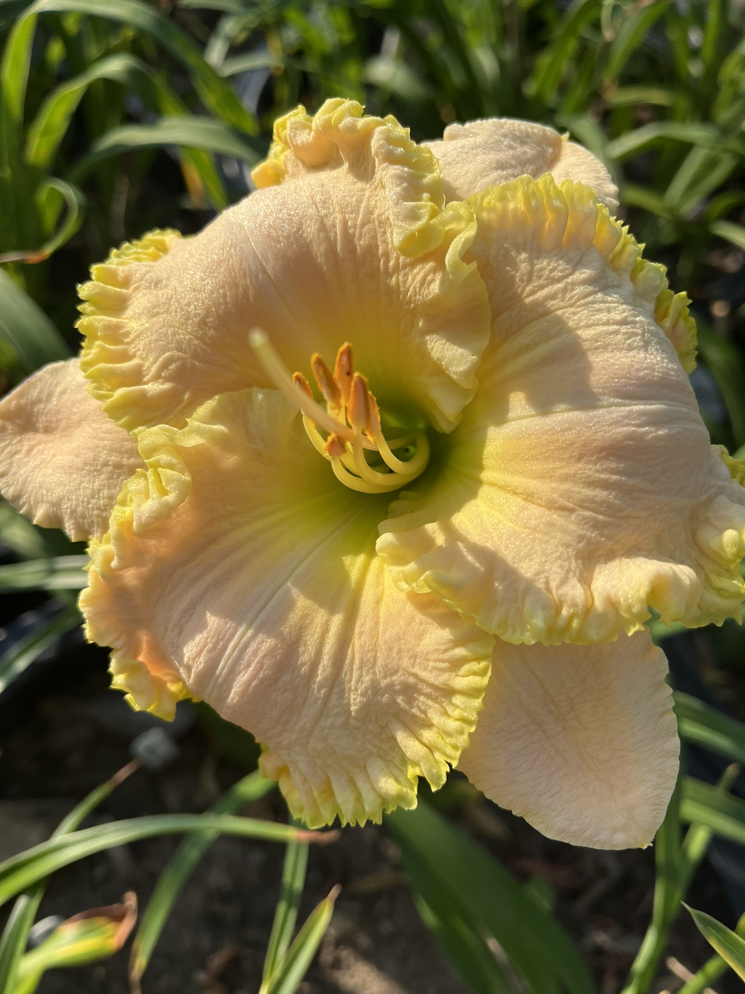 Cream with green and gold edge. Dormant. Korth said: “‘June Wedding Vow’ is a much improved flower out of our award winning ‘August Wedding’. Compared to ‘August Wedding’, ‘June Wedding Vow’ has a higher bud count, the flowers have wider petals, and the flower fancier edge (chartreuse with teeth). The newer ‘June Wedding Vow’ has the same great opening and fertility as ‘August Wedding’. This is a great garden plant.” Main pix from Korth. Other ones from us.