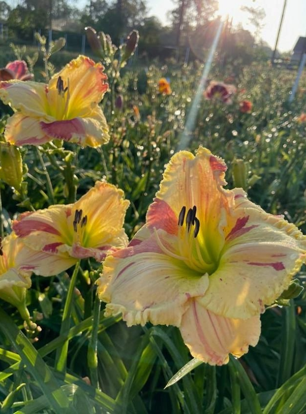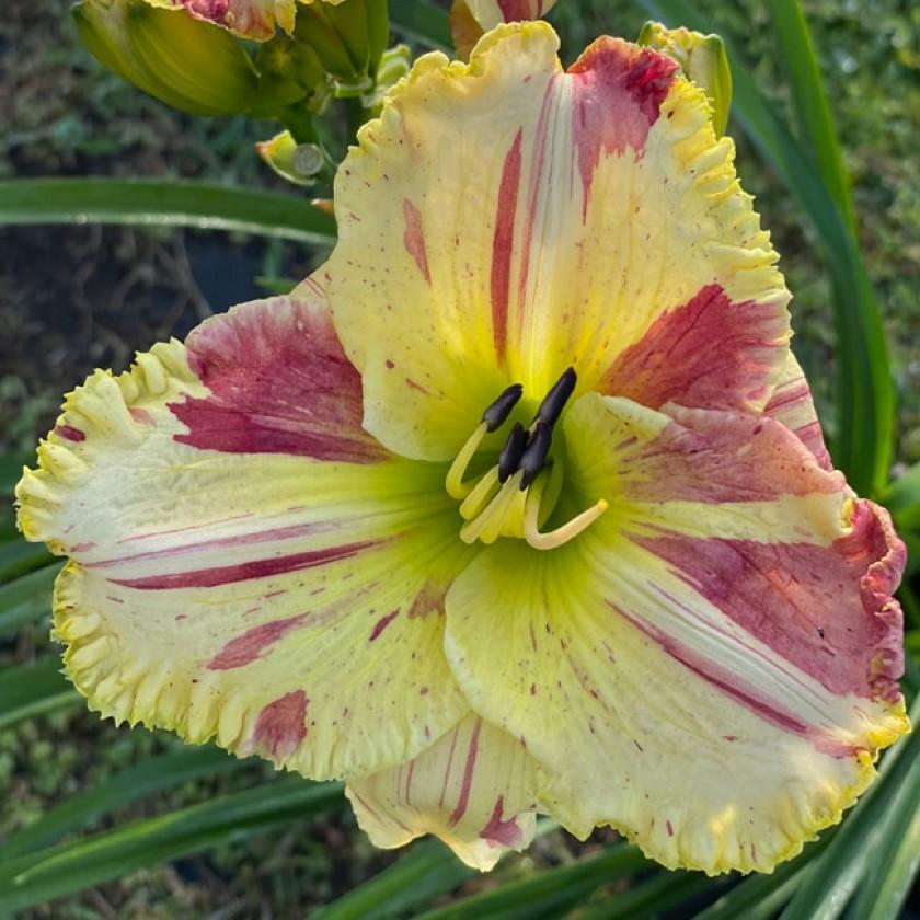Another great addition to the genetic material of the Broken Colours category! Light cream with bright pink variegated stripes, splotches, and spots, green throat.. ((Janet and Bill x Laws of Illusion) x Undefinable) Semi-evergreen. 20 buds. Pix from DeVito and the Internet.