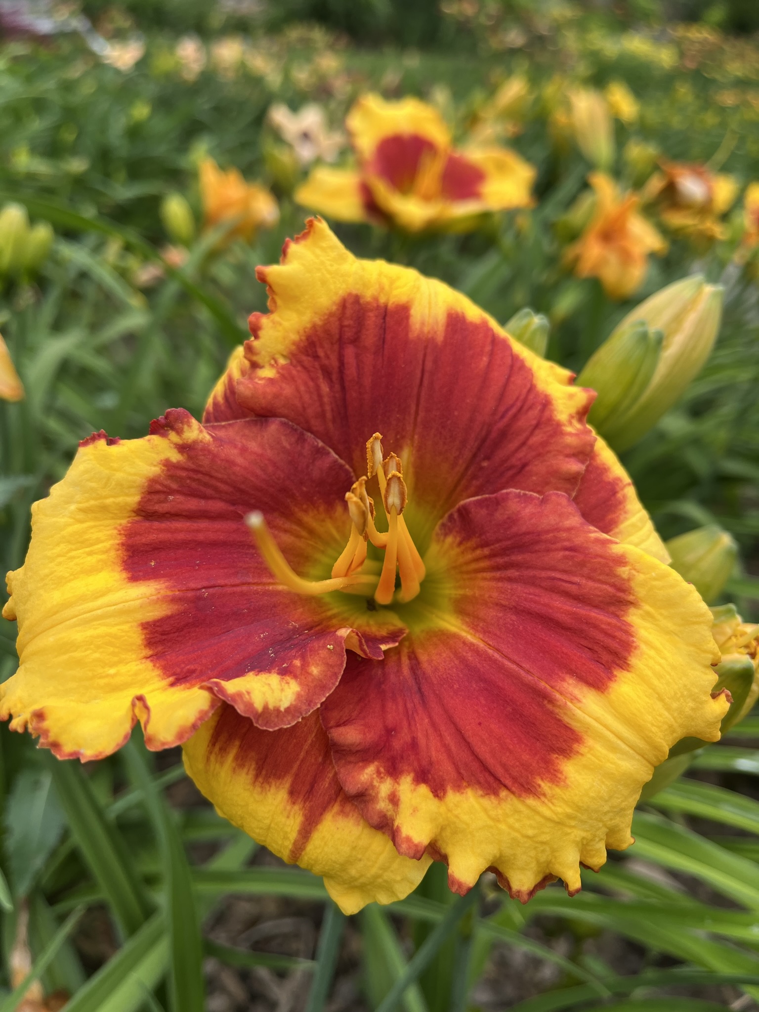 Brilliant gold with huge red eye, red edge and green throat. Great colour and form. Excellent breeder and garden plant. FAST FAST FAST GROWER.