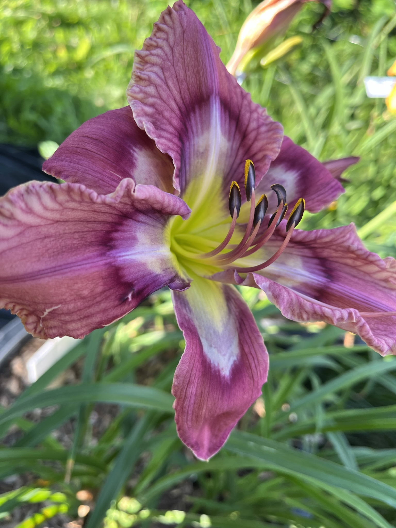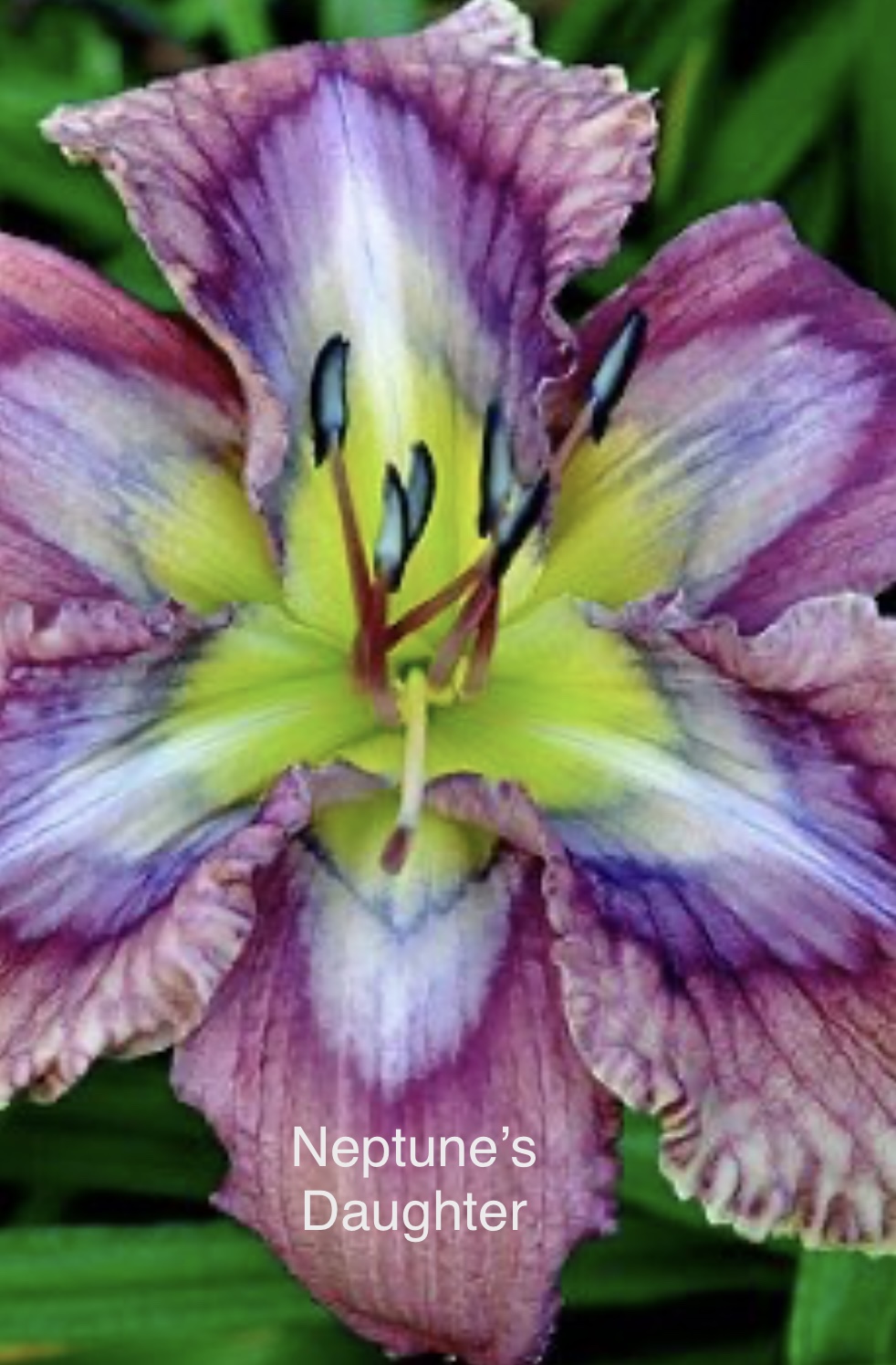 Ruffled pink lavender with chartreuse throat, purple, silver and violet eye that extends onto the sepals. Evergreen. Pix from hybridizer.