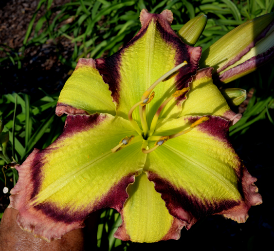 Basically, a huge, flat and diamond-dusted green flower with a colored border. Semi-evergreen. 40 buds. Pix from hybridizer.