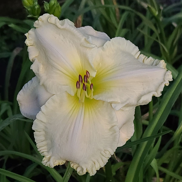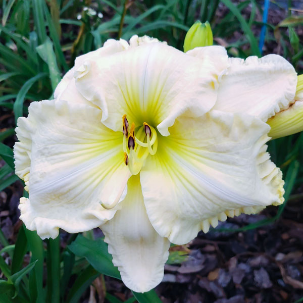 From the hybridizers: “Spacecoast Big Frosty is an early bloomer, this gorgeous, 9 inch-plus near white daylily will begin the bloom season with a spectacular show. She has great substance. This is one monster bloom, one of the biggest I have seen in a round flower. We call this the hibiscus form. Very rare genetics from a conversion that I paid $2,000 from Larry Grace. We always called the conversion, 2K. Some reverted back, but after testing many plants via flow cytometer, I have a 100% full tetraploid conversion of My Cup Overflows. This conversion was used to get SC Big Frosty. A very important daylily to be hybridized with some of the other large forms. A very outstanding Daylily with great plant habit and bud count.” Evergreen. 21 buds. Pix from hybridizers. SOLD OUT AT SPACECOAST GARDENS.