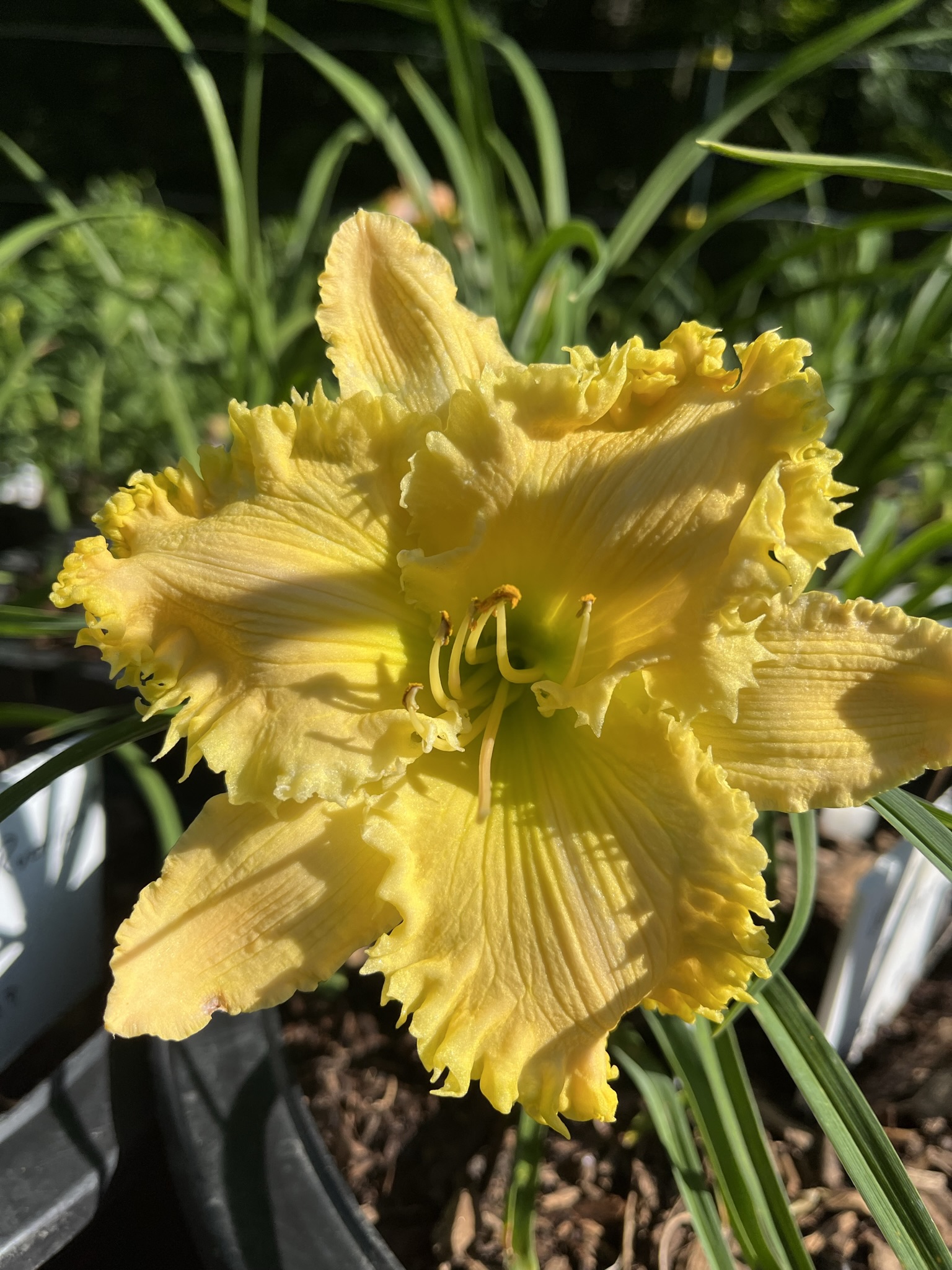 We just love this yellow polychrome flower with a heavily ruffled, toothy edge. Semi-evergreen. Main pix from unknown Internet source. Other pix from us.