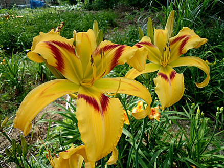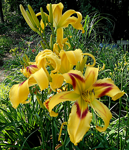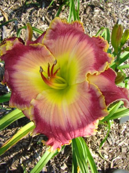 From Gossard: "Blue Beetle has creme pink flowers with a eye zone of charcoal, light blue, blue, lavender blue, lavender purple, purple, maroon and maroon red. Petals even have a start of a gold edge, see outside photo. Blue Beetle is my best introduction for 2010 for many reasons. One of the difficulties of hybridizing for Blue eyed daylilies is that they are blue in the morning and by noon they are more lavender. Blue Beetle is my best one which retains the blue eye in the afternoon, it was and still is my number 1 parent for blue daylilies. Substance is very good and flowers hold up to the evening hours. Thus, I consider Blue Beetle a real break though. Third of the way through bloom, it starts to double. Rebloom scapes can be fully double. Because it does not double all the time, it was not registered as a double. Blue Beetle's form is in between and can be utilized in round or narrow hybridizing." Semi-evergreen. 18-22 buds.